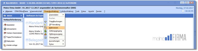 1. | Klicken Sie mit der Maus im Hauptmenü auf "Finanzbuchhaltung > Mahnwesen". |