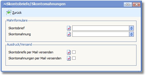 << Hier KLicken um eine Inhaltsübersicht anzuzeigen >> Navigation: Finanzbuchhaltung > Stammdaten > Basisdaten > Mahngruppen > Mahngruppe erfassen/ändern > Die Karteikarte "Standard" > Skontobriefe/Skontomahnungen |