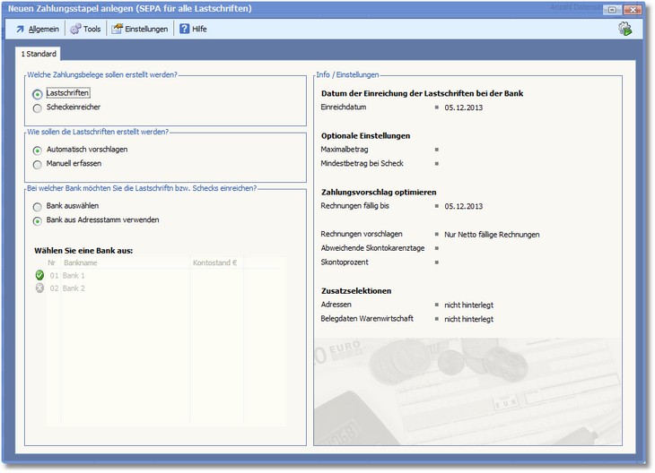 Der automatische Zahlungsvorschlag erstellt Zahlungsbelege, die Sie bei Ihren jeweiligen Hausbanken in Form einer Diskette, per internem Banking, externem Banking oder in gedruckter Form einreichen. Diese vom Programm generierten Zahlungsaufträge werden in der Karteikarte "Zahlungsstapel" abgelegt und können Sie vor Weiterleitung bearbeitet werden.