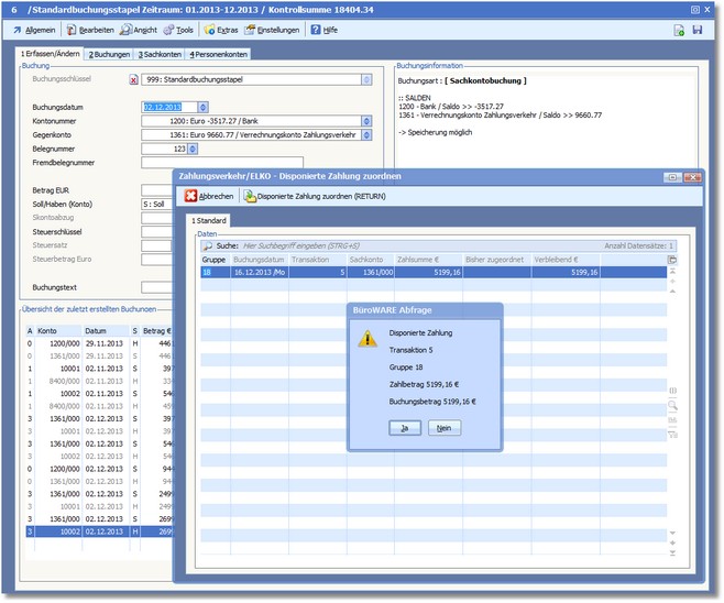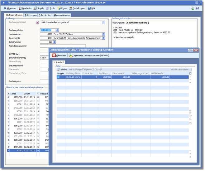 Beim Speichern der Buchung wird das Dialogfenster "Zahlungsverkehr/ELKO - Disponierte Zahlung zuordnen" aufgerufen.