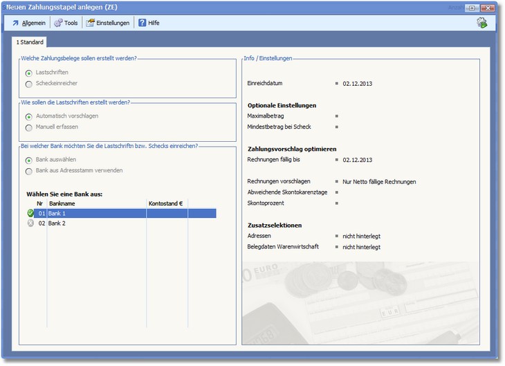 Legen Sie in diesem Bereich durch Aktivierung der entsprechenden Option fest, ob Sie Lastschriften oder Scheckeinreicher erstellen wollen.