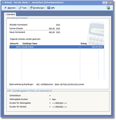 Sie können im Zahlungseingang > Karteikarte "Zahlungsstapel" einen Zahlungsstapel mit der Tastenkombination [STRG]+[1] oder über den Menüeintrag "Tools > Scheckeinreicher ausdrucken" an die Bank übertragen. Es wird dabei ein Dialogfenster mit einer Übersicht der zu exportierenden Zahlungsdaten geöffnet: