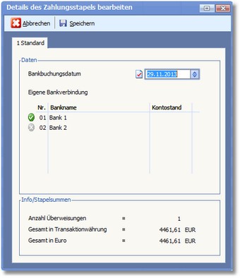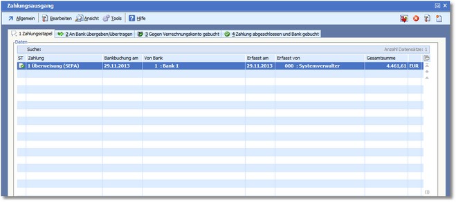 Mit [F9] werden die Zahlungsstapel anschließend an die Bank übertragen und in die Karteikarte "2 An Bank übergeben/übertragen" verschoben.