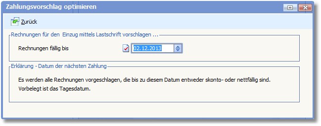 << Hier KLicken um eine Inhaltsübersicht anzuzeigen >> Navigation: Finanzbuchhaltung > Zahlungsverkehr > Zahlungseingang > Die Karteikarte "Zahlungsstapel" > Neuen Zahlungsstapel anlegen > Neuen Zahlungsstapel anlegen - Menü > Zahlungsvorschlag optimieren |