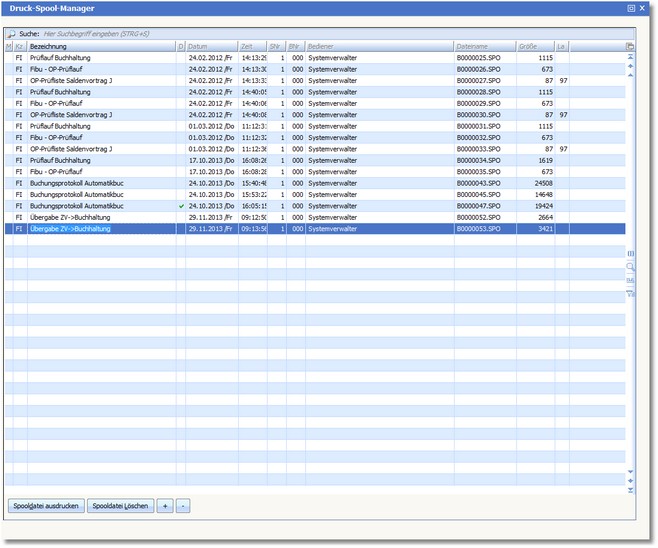 Der Spoolmanager ist ein Dialogsystem, welches die Spooldateien für den Anwender tabellenartig aufbereitet. Sie erreichen ihn im Hauptmenü über "Finanzbuchhaltung > Extras > Druckspoolmanager".