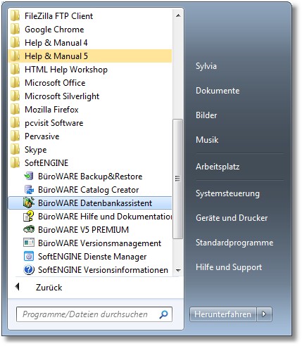 3. auf "SoftENGINE" und klicken Sie auf "BüroWARE Datenbankassistent".