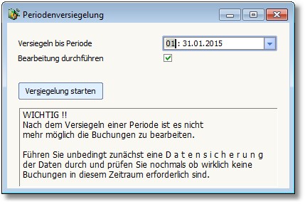 Versiegelt werden alle Perioden bis zu der in diesem Feld angegebenen Periode. Geben Sie also die Periode 3 an, so werden die Perioden 1,2 und 3 versiegelt bzw. abgeschlossen. |