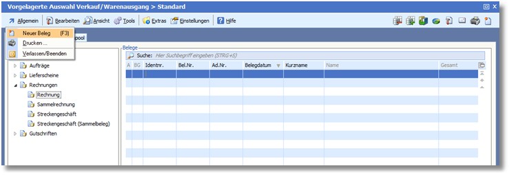 Markieren Sie die gewünschte Beleggruppe und starten Sie die Anlage mit <Beleg anlegen (F9)>.