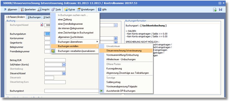 Im Anschluss kann die „Steuerverrechnung Istversteuerung“ aus dem Buchungsstapel heraus vorgenommen werden: