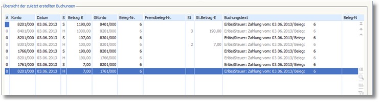 In der „Übersicht der zuletzt erstellten Buchungen“ sind die Steuerverrechnungsbuchungen ersichtlich: