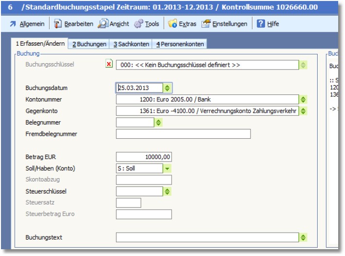 Aufgrund des aktivierten Zugriffsrechts kann in der Buchungserfassung die Transaktion zugeordnet werden: