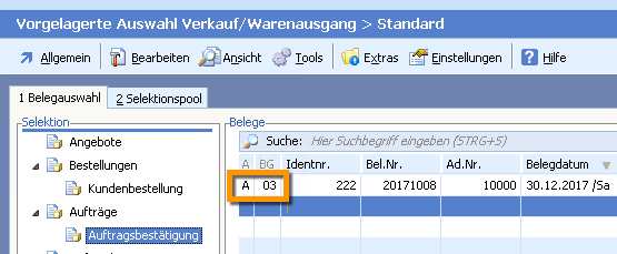 Belege sind immer durch eine Belegart (Warenausgang z.B. A=Auftrag, R=Rechnung, Wareneingang z.B. b=Bestellung, l=Lieferschein) und eine Beleggruppe (z.B. 00,01,03) gekennzeichnet.