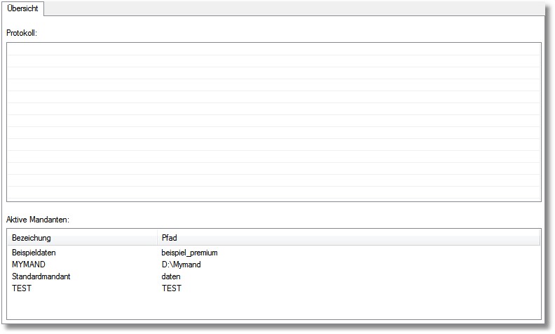 Des Weiteren befindet sich eine Ansicht der aktuell aktiven Mandanten auf dieser Karteikarte. Darin werden alle derzeit aktiven Mandanten mit ihrem Namen und dem Datenpfad aufgeführt.