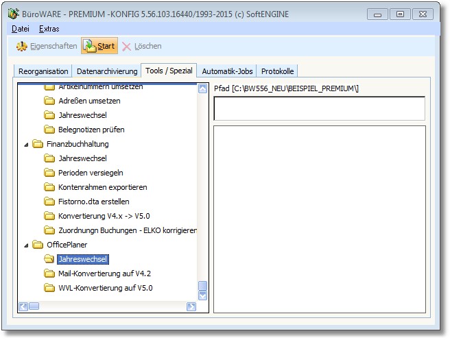 Markieren Sie im Verzeichnisbaum unter "OfficePlaner" den Ordner "Jahreswechsel" mit einem Mausklick und betätigen Sie dann den Button <Start> in der horizontalen Symbolleiste des Datenbankassistenten.
