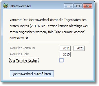 Mit dem Button <Jahreswechsel starten> wird nun der Jahreswechsel durchgeführt und alte Termindaten gelöscht.