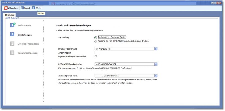 Legen Sie über diese Option fest, wie Sie die entsprechenden Dokumente versenden wollen. Entweder als Papierdruck oder über den PDF-Mailer, wenn Sie über den PDF-Mailer Professional verfügen.