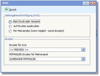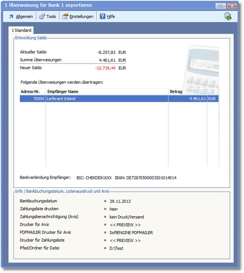 Hier können Sie die Einstellungen zum Zahlungsausgang überprüfen und ggf. über die Funktionen der Menüleiste bearbeiten.