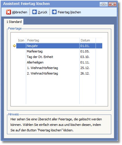 Es kann jeweils nur ein einzelner Feiertag gelöscht werden. Markieren Sie diesen mit dem Auswahlbalken und klicken Sie auf <Feiertag löschen>.