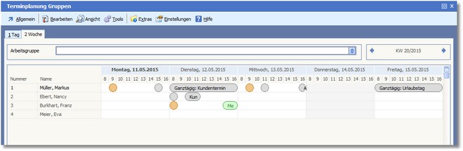 << Hier KLicken um eine Inhaltsübersicht anzuzeigen >> Navigation: OfficePlaner > Terminverwaltung > Gruppenplanung > Die Karteikarte "Woche" |