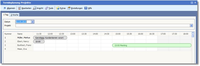 Hier wird die Tagesübersicht für ein auszuwählendes Projekt angezeigt. In einer Tabelle werden die dem Projekt zugeordneten Mitarbeiter sowie deren Termine angezeigt. Die Farbe der Termine wird von der Terminkategorie bestimmt.