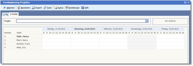 << Hier KLicken um eine Inhaltsübersicht anzuzeigen >> Navigation: OfficePlaner > Terminverwaltung > Projektplanung > Die Karteikarte "Woche" |