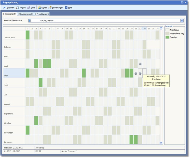 Die Tagesplanung wird mit der Jahresansicht für den aktuellen Mitarbeiter geöffnet.