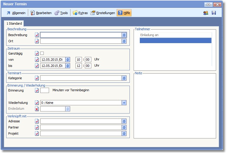<< Hier KLicken um eine Inhaltsübersicht anzuzeigen >> Navigation: OfficePlaner > Terminverwaltung > Terminplanung > Arbeiten mit Terminen > Termine bearbeiten - Karteikarte "Standard" |