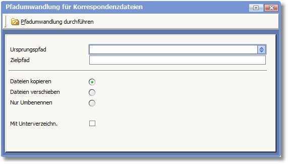 [ALT]+[P] öffnet ein Dialogfenster zur Pfad-Umwandlung. Sie können durch die Angabe von Ursprungspfad und Zielpfad die Pfadangabe für die Dokumentenablage global ändern. Legen Sie weiterhin fest, ob die Dateien aus dem Ursprungspfad kopiert, verschoben oder ob lediglich der Pfadeintrag in der Tabelle geändert werden soll.