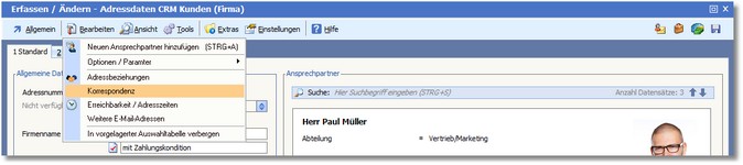1. Klicken Sie in der Adressbearbeitung mit der Maus auf den Menüpunkt "Bearbeiten > Korrespondenz".