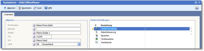 Die Basisdaten - CRM/OfficePlaner werden geöffnet.