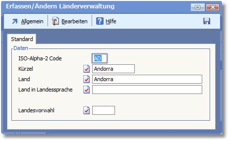 << Hier KLicken um eine Inhaltsübersicht anzuzeigen >> Navigation: OfficePlaner > Stammdaten > Basisdaten > Länderverwaltung > Länder erfassen/ändern > Die Karteikarte "Standard" |
