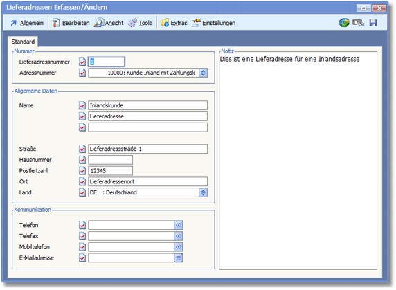 Die Daten zu einer Lieferanschrift werden in dieser Karteikarte verwaltet.