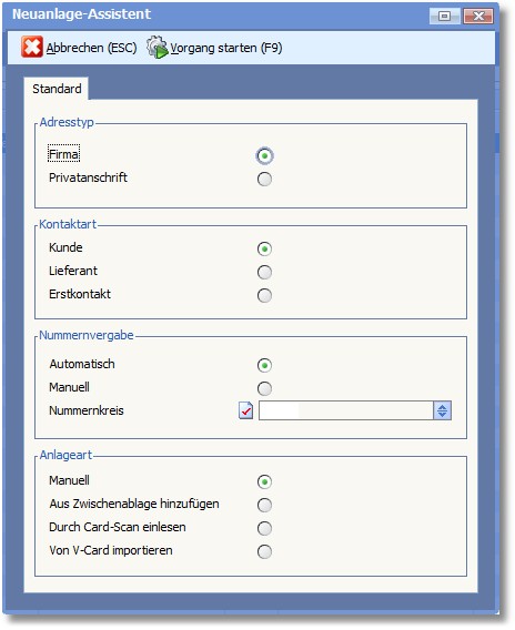 Legen Sie in diesen Bereichen durch Aktivierung des entsprechenden Radiobuttons fest, um welchen Adresstyp bzw. welche Kontaktart es sich bei der neu anzulegenden Adresse handelt.