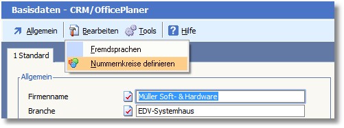 1. Klicken Sie mit der Maus in der Menüleiste der CRM-Basisdaten auf "Bearbeiten > Nummernkreise definieren".