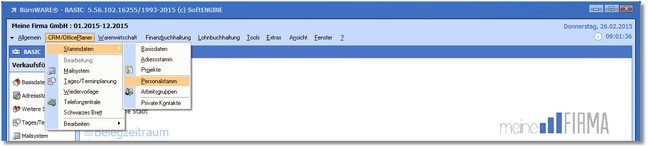 1. Klicken Sie mit der Maus im Hauptmenü auf "CRM/OfficePlaner > Stammdaten > Personalstamm".