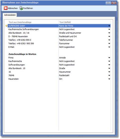 Diese Funktion ermöglicht die Übernahme von Adressen, die z.B. aus dem Impressum von Webseiten mit Hilfe der Zwischenablage in das Textfeld kopiert und in die entsprechenden Fenster eingelesen werden. Die Adresse kann so einfach und schnell als