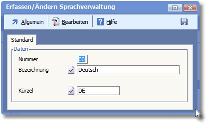 << Hier KLicken um eine Inhaltsübersicht anzuzeigen >> Navigation: OfficePlaner > Stammdaten > Basisdaten > Sprachen > Sprachen erfassen/ändern > Die Karteikarte "Standard" |