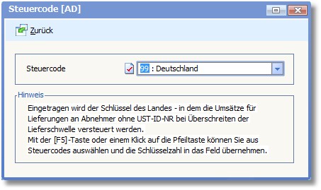 << Hier KLicken um eine Inhaltsübersicht anzuzeigen >> Navigation: OfficePlaner > Stammdaten > Basisdaten > Länderverwaltung > Länder erfassen/ändern > Die Karteikarte "Standard" > Steuercode |