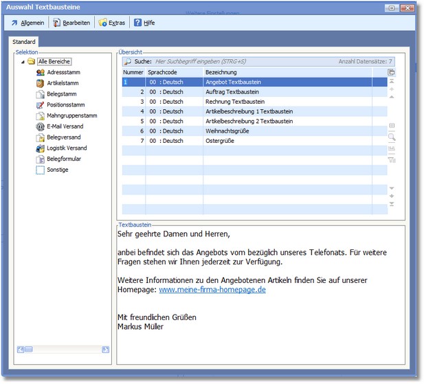 << Hier KLicken um eine Inhaltsübersicht anzuzeigen >> Navigation: OfficePlaner > Stammdaten > Basisdaten > Textbausteine |