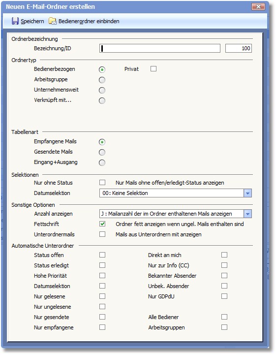 Das Programm öffnet den Dialog „Neuen E-Mail-Ordner erstellen". 3. Klicken Sie mit der Maus in der Symbolleiste auf den Button <Bedienerordner einbinden>. Es werden zwei zusätzliche Felder in den Dialog eingefügt: