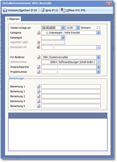 << Hier KLicken um eine Inhaltsübersicht anzuzeigen >> Navigation: OfficePlaner > Wiedervorlage > Kontaktdetails |