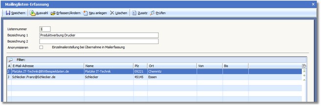 [ALT]+[P] prüft die Mailingliste auf falsche Mailadressen und mehrfach hinterlegte Einträge.