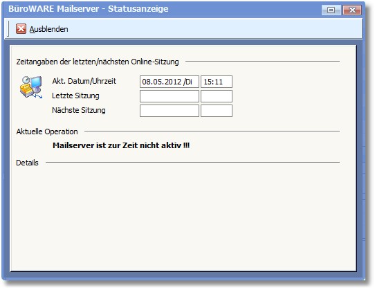 << Hier KLicken um eine Inhaltsübersicht anzuzeigen >> Navigation: OfficePlaner > Mailsystem > Mail einrichten > E-Mail-Assistent - Extras > Mail-Server Statusanzeige |