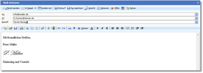 1. Klicken Sie in der horizontalen Symbolleiste des Dialogs „Mail erfassen" auf den Button <Entwurf>. Das Programm speichert die E-Mail im Ordner „Entwürfe". Die E-Mail bleibt solange in diesem Ordner, bis Sie diese erneut bearbeiten und versenden (Direkt oder Stapel).