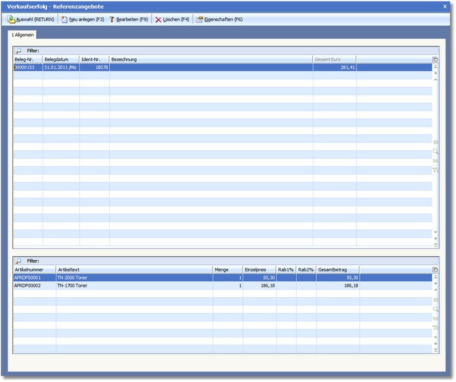 Um den Erfassungsaufwand zu verringern, können Referenzangebote (vorgefertigte Musterangebote) beim Anlegen neuer Angebote genutzt werden. Artikelpreise, Texte etc. können dabei entweder vom Referenzangebot oder aktuell aus den Artikelstammdaten übernommen werden. Das bedeutet, auch wenn die Artikel im Referenzangebot schon einige Jahre alt sind, werden für das neue Angebot trotzdem die aktuellen Preise herangezogen. Ist eine Position nicht mehr im Artikelkatalog enthalten, wird automatisch der Preis aus dem Referenzangebot vorgeschlagen. Kalkulationsdaten sowie Artikelpositionen können beim Erstellen des neuen Angebots geändert, eingefügt oder gelöscht werden.