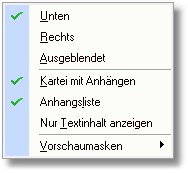 1. Klicken Sie auf den Button <Ansicht> in der Menüleiste des Mailassistenten und wählen Sie im Dropdownmenü den Menüpunkt "Vorschaufenster", welcher Ihnen weitere Optionen zur Verfügung stellt.