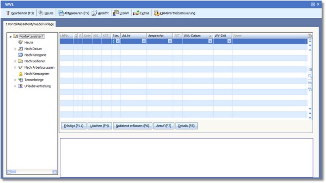 Die Wiedervorlagenverwaltung ermöglicht Ihnen die Verwaltung Ihrer Wiedervorlagen. Die Kontakte können Sie mit Wiedervorlagedatum und Uhrzeit in einer Tabelle hinterlegen und zu dem angegebenen Zeitpunkt bearbeiten.