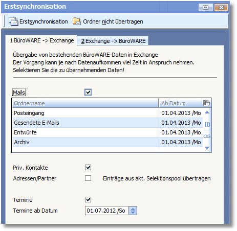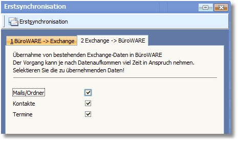 Aktivieren Sie im Synchronisationstool die Karteikarte "1 BüroWARE -> Exchange".
