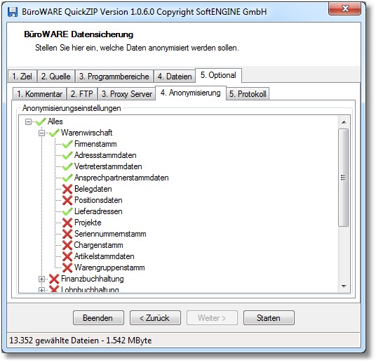 In diesem Dialogfenster können die zu anonymisierenden Datenbereiche gewählt werden.