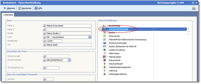 Der Adressnummernkreis ist für Kreise in den Adressen vorgesehen, muss sich aber innerhalb der Grenzen der Nummernkreise der Basisdaten bewegen.